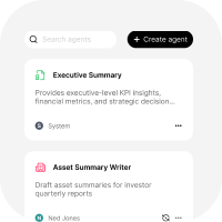 Simon agents plan and complete multi-step tasks: drafting memos, synthesizing performance data, compiling quarterly reports, routing approvals. Every action is grounded in the Knowledge Graph and governed by your firm's permissions.