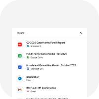 Ask Simon in plain language and get instant, permission-aware answers across every system, document, and dataset in your firm. Surface the right person, the relevant context, or the data point buried in a model.